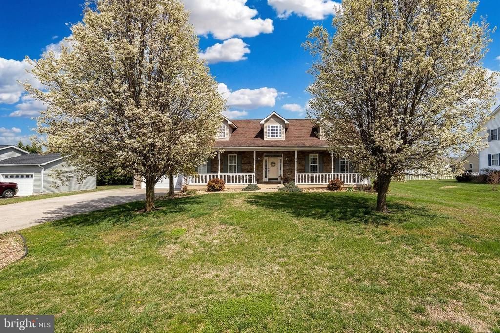 Welcome to this beautifully maintained Cape Cod home in the quiet Deerfield Subdivision, offering charm, space, and move-in ready comfort. A paved driveway leads to a large, inviting front porch—perfect for relaxing and enjoying peaceful surroundings. Inside, you’ll find gleaming wood floors throughout the main level, a spacious family room with a cozy fireplace, and an open flow into the dining area and kitchen, making entertaining easy. The kitchen is filled with natural light and features updated appliances, recessed lighting, under-cabinet lighting, and a stylish tile backsplash. The main-level primary suite offers a generous walk-in cedar closet and a private en-suite bath with tile flooring and a walk-in shower, while an additional bedroom and full bath are conveniently located nearby. Upstairs, a classic wood staircase leads to a bright and airy flex space or recreation area with dormer windows and charming window seats, along with two spacious bedrooms and another full bath. The fenced backyard is lined with privacy trees and includes a deck for outdoor enjoyment, plus a matching outbuilding with electricity for added storage or workspace. The attached garage is equipped with cabinetry, a work area, and connects to a convenient laundry/mudroom. The unfinished basement offers excellent storage or future expansion potential, already set up with plumbing for a bathroom and its own propane heat source. Come check it out today!